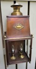 Cambridge Estate wall lantern in antique copper, shown with optional seedy glass with 2 lights and cast-brass wall bracket. Size shown: 8"W x 26"H, extends 10-1/2". Available in other sizes, finishes and glass. The Cambridge Estate wall lantern adds an elegant flare to a traditional colonial design from its boxed cage-like cross bars to its flowing cast-brass scrolls. This hand-crafted lantern is sure to be noticed by your guests as you welcome them to your home.