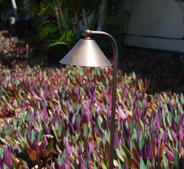 Top Mount Bell Path Light: Shown in optional acid-washed rust cast brass. Size:7"W x 22"H, 1 light (LED 3 watt OMNI 3). Other finishes available. Comes with a 9" ABS mounting stake.