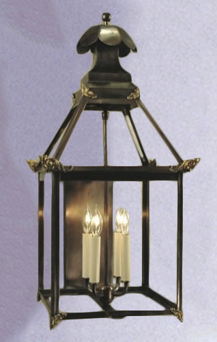 Carteret Street Lamp copper wall lantern in dark copper with brass accents, clear glass and 4 lights. Size shown:26"H x 12.5"W, extends 15". (Must ship truck). Available in other finishes, glass options and sizes. The Carteret Street Lamp is a beautiful new addition to our southern line of fixtures. The simple lines are adorned with decorative accents that add a unique flare to a classic piece. Our lanterns are handmade and designed in the Low-Country. Be sure to ask about our "turtle friendly" lighting options. All of our handcrafted lanterns are made of a heavy gauge copper or brass with cast brass structural supports (no punch riveting, all hand-soldered, no steel parts). Custom sizing and custom trim are available. We can change any lantern to gas. All lanterns come in wall mount, post top or hanging versions. We can make sconces to match or smaller garden models. We can make any of our lanterns ADA compliant. Several aging processes are applied to the copper or brass to give rich, interesting patinas. You can choose the light cluster option and glass to meet your needs. Our lanterns are well suited for interior as well as exterior applications and hold up in extreme climates and salt-water conditions. Made in the USA and built to last a life time! UL APPROVED