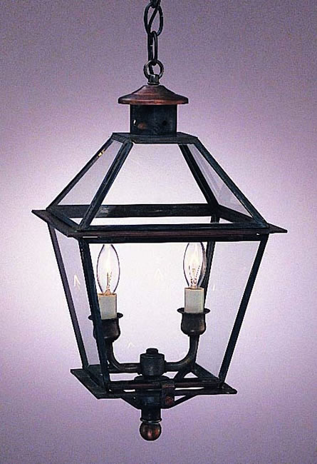 Old Philadelphia Lantern - interior/exterior hanging light in dark copper, 2 lights, clear glass. Size shown: 9-1/2"wide x 17-1/2"high. Available in other finishes, sizes and glass. Metal or glass top option available. NOTE: MUST SHIP BY TRUCK The Old Philadelphia lantern was commonly used as street lights in Philadelphia after the American Revolutionary War. This colonial classic and best selling lantern can be found today in the Independence Mall, Society Hill and historic Philadelphia.
