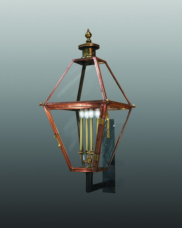 Old Southern Wall Lantern in solid copper in antique copper finish with brass wall bracket, 3 lights, clear glass.  Call us for other sizes and finishes. Size shown:13"W x 28"H, extends 10". NOTE: MUST SHIP BY TRUCK. Truly a spectacular fixture, grand in scale and understated in its elegance. This handcrafted wall lantern is worthy of a great estate. This lantern is an exquisite work of art that has been specially designed to showcase our highest quality craftsmanship. The use of iron or copper, the attention to detail, and the complex varied finishes make this line of fixtures the pinnacle of handcrafted lighting in the industry. UL APPROVED