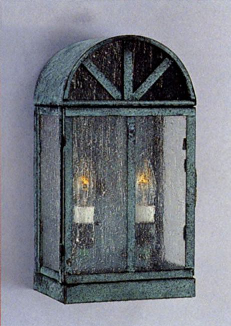Western Roll-top wall lantern in verdi green finish shown with optional seeded glass, 2 lights. Size shown: 6-1/2"W x 11-1/2"H, extends 4-1/2". Available in other sizes, finishes and glass. Reminiscent of the old-west wagon wheels, this hand-crafted fixture will add character to any home or office. All of our handcrafted lanterns are made of a heavy gauge copper or brass with cast brass structural supports (no punch riveting, all hand-soldered, no steel parts). Custom sizing and custom trim are available. We can change any lantern to gas. All lanterns come in wall mount, post top or hanging versions. We can make sconces to match or smaller garden models. We can make any of our lanterns ADA compliant. Several aging processes are applied to the copper or brass to give rich, interesting patinas. You can choose the light cluster option and glass to meet your needs. Our lanterns are well suited for interior as well as exterior applications and hold up in extreme climates and salt-water conditions. Made in the USA and built to last a life time! UL APPROVED